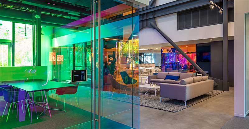 Trong môi trường làm việc, kính màu là giải pháp hoàn hảo để tạo ra không gian hiện đại, năng động và sáng tạo. Văn phòng sẽ trở nên sáng sủa và thoáng đãng với những vách ngăn kính. Màu sắc của kính cũng có thể ảnh hưởng tích cực đến tâm trạng và năng suất làm việc. Ví dụ, màu xanh lá cây giúp giảm stress, màu xanh dương tạo cảm giác yên bình, trong khi màu đỏ kích thích sự sáng tạo. Kính không chỉ giúp phân chia không gian một cách tinh tế mà còn góp phần tạo nên một môi trường làm việc hiệu quả.